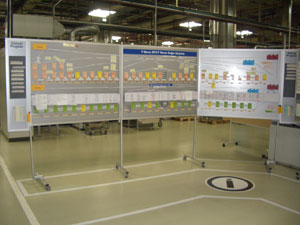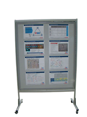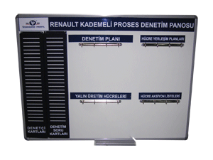 MIKNATISLI PANO : Değer akışı haritalandırmada da kullanılan bir panodur. Mınatısla kullanılır. Tekerlekli ve çift taraflı olmasının yanısıra katlanabilme özelliği ile de yer kaplamaz. Yan paneller örnek de güncel ve bitmiş projeler bölümü olarak kullanılmış, malzeme olarak da kanban cepleri pleksi broşürlük ve kalemlikl monte edilmiş, çok kullanışlı bir panodur. |